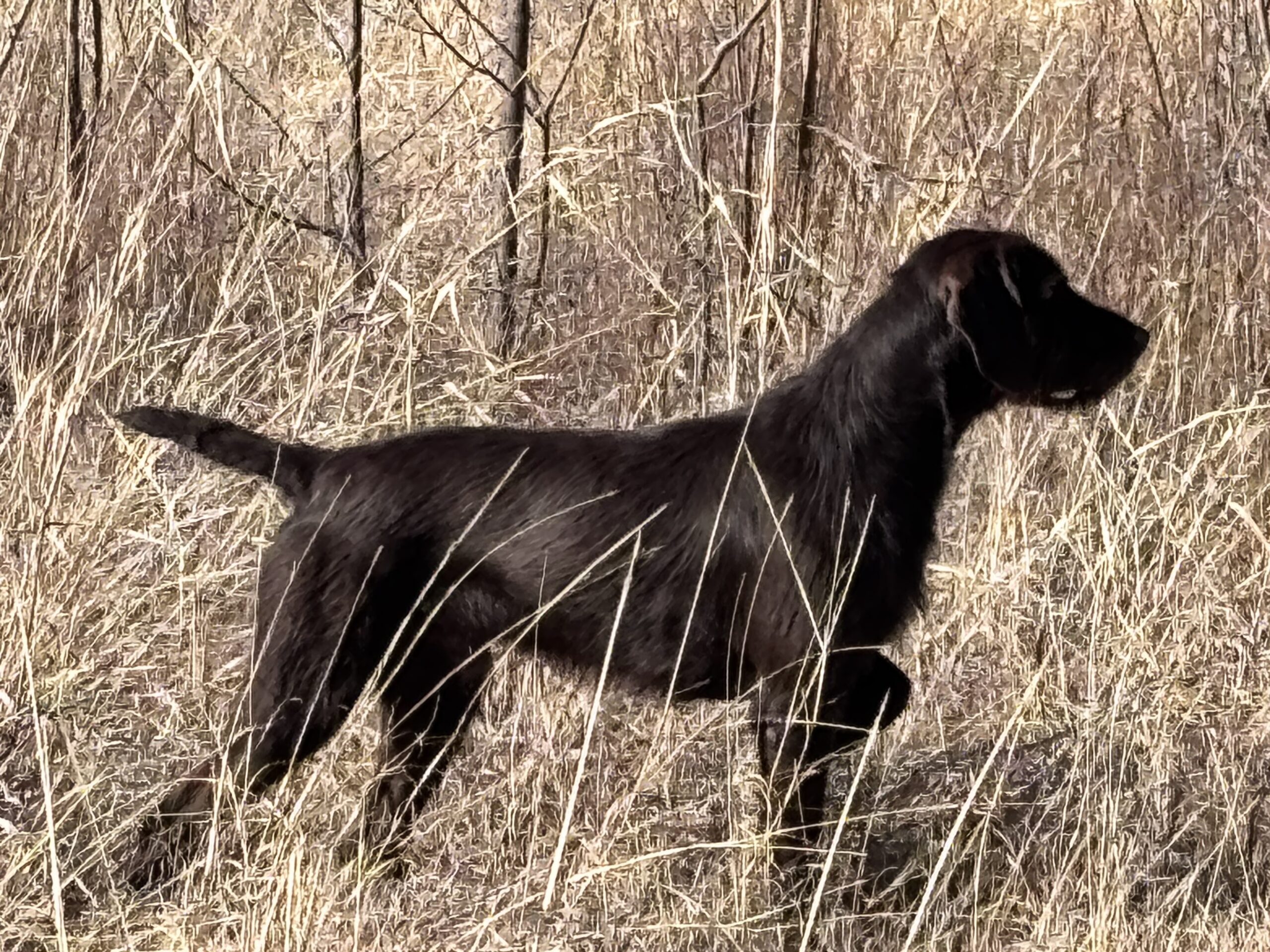 Sage is the pup we kept from our A litter out of Kindle and Stone Pine’s Blue. Her sire resides in Oregon and comes from one of the last litters that the late Bodo Winterhelt (largely given credit for bringing the Pudelpointer to North America) ordained before…
